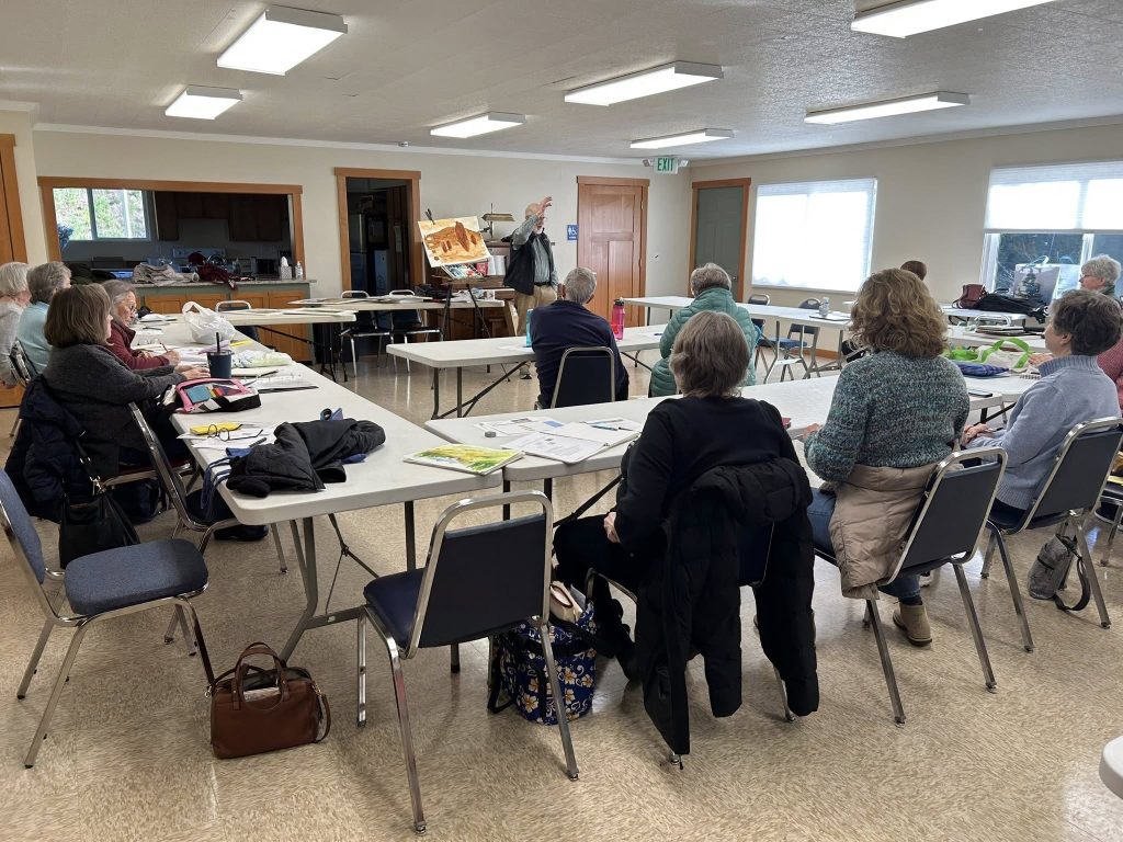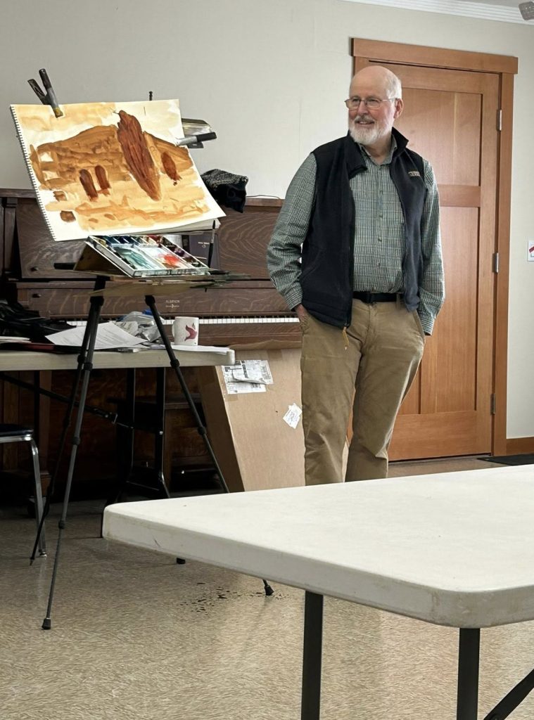 On March 19, artist David Repyak shared his process of painting a watercolor. He showed us his materials and shared his philosophy of painting. He painted a watercolor showing us how he layers his washes from light to dark and from back to front, and how he evaluates and adjusts as he paints.