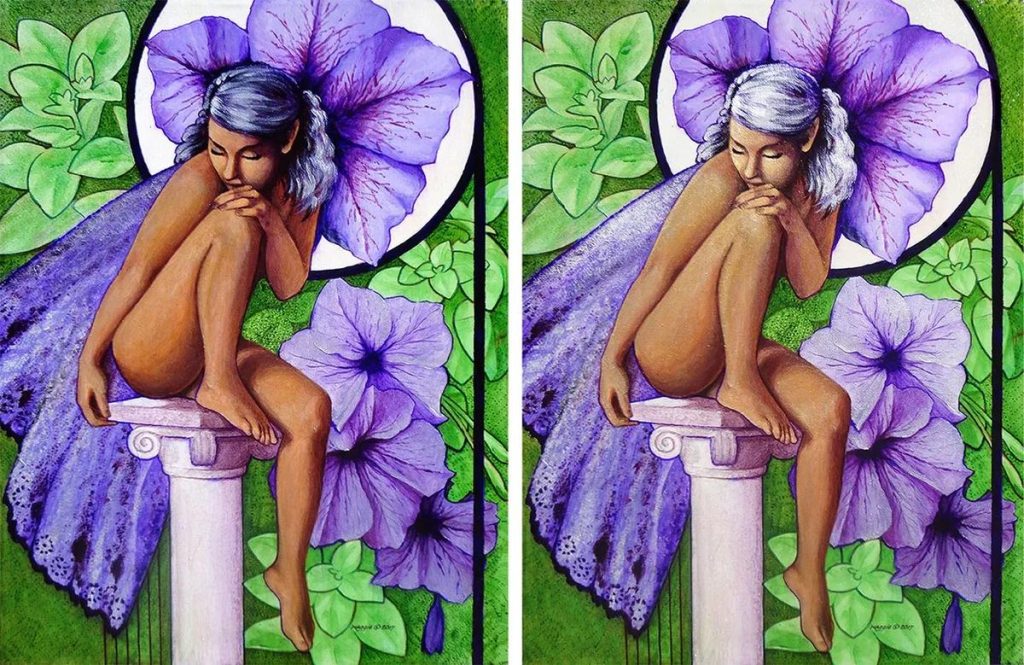I use special iridescent and interference pigments in my acrylic work. These tend to look different depending on lighting conditions. Unfortunately, this does not show up in photographs. Two versions of this painting are shown to illustrate the special effects.