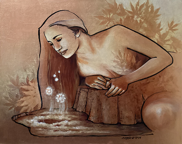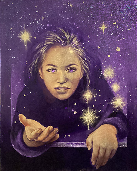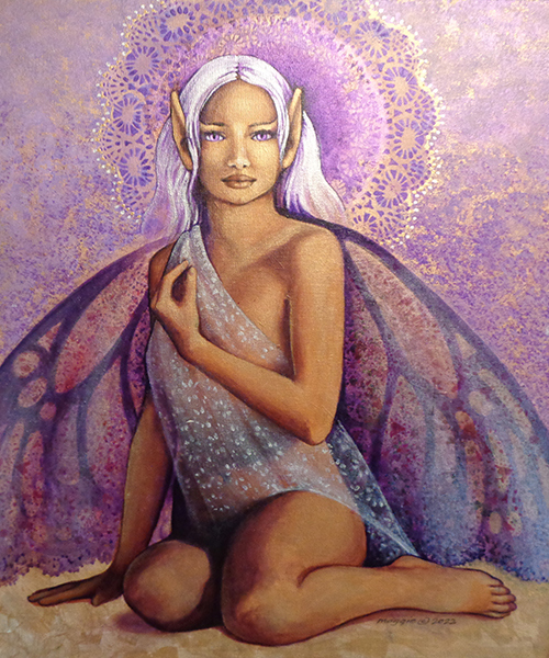 I use special iridescent and interference pigments in my acrylic work. These tend to look different depending on lighting conditions. Unfortunately, this does not show up in photographs. Two versions of this painting are shown to illustrate the special effects.